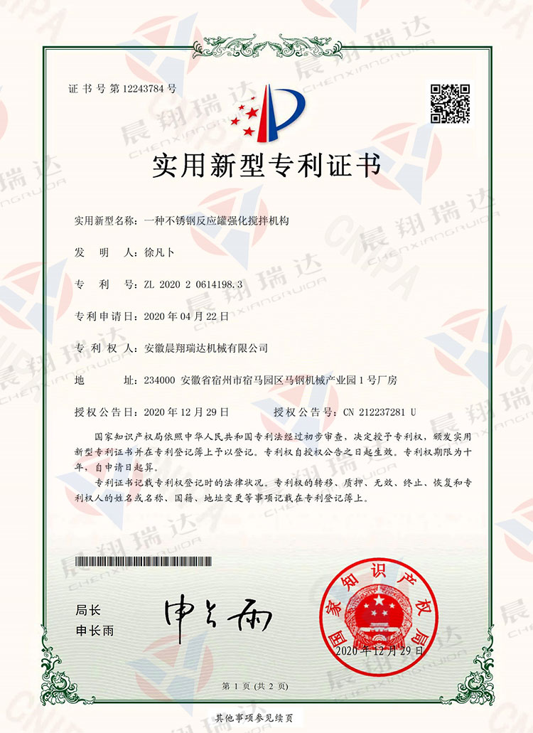 實(shí)用新型專(zhuān)利證書(shū):一種不銹鋼反應(yīng)釜強(qiáng)化攪拌機(jī)構(gòu)