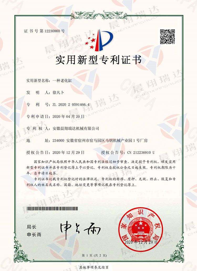 實(shí)用新型專(zhuān)利證書(shū):一種老化缸